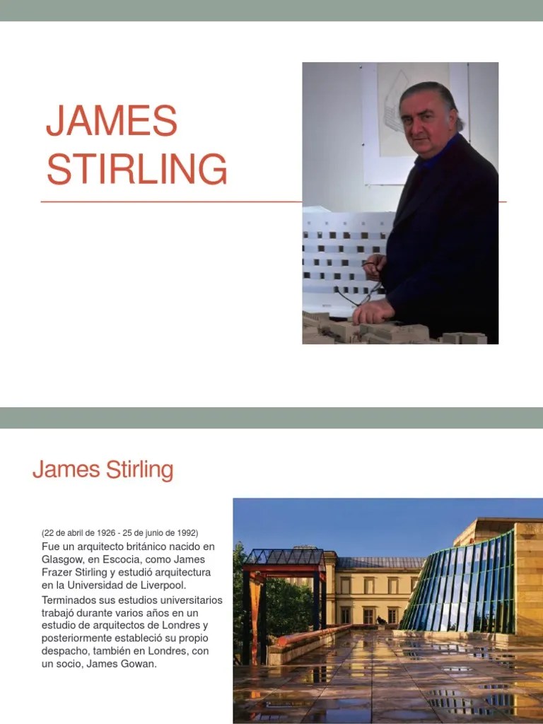 Creció en liverpool, una de las zonas industriales de inglaterra del norte... 13.07.2018 · james stirling nació en glasgow, escocia en 1926. Stirling trabajó en sociedad con james gowan desde 1956 hasta 1963, luego con michael wilford desde 1971 hasta 1992. Después de trabajar tres años en el estudio de lyons, israel y ellis, fundó su propia compañía con james gowan en 1956.. Nacido en glasgow y verdadero postmodernista, sir james stirling se rebeló contra el conformismo.