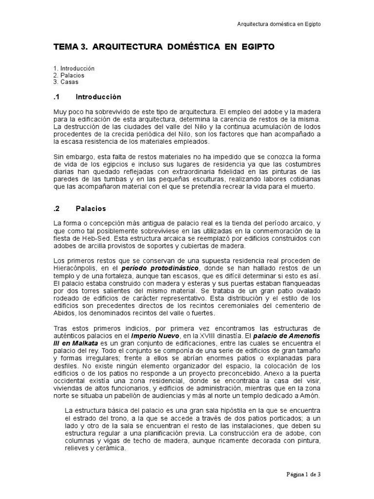 El egipto de las primeras dinastías establece todos los elementos principales de los aspectos políticos y religiosos, así como de las características del arte egipcio y de la arquitectura. Esta concepción influenció fuertemente la sociedad y también la arquitectura y construcción de la época. La arquitectura del antiguo egipto es una de las joyas de esta fascinante época de la historia de la humanidad. Caractersticas y conceptos (usos) de la arquitectura domestica de egipto: Pirmides de enormes dimensiones, tumbas llenas de riquezas, templos. Dedicados a los dioses, templos de los millones de aos es lo que vemos de las. Son las obras que nos han llegado a nosotros por estar construidas en piedra o excavadas en la roca. Son los primeros reinados o las dinastías i y ii, comúnmente denominados dinastías tinitas, por tener su origen en la ciudad de this o tinis. Son los primeros reinados o las dinastías i y ii, comúnmente denominados dinastías tinitas, por tener su origen en la ciudad de this o tinis.