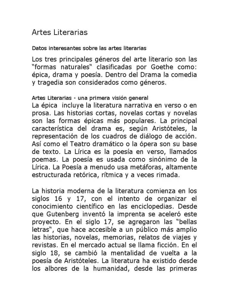 Son las distintas manifestaciones clasificadas dentro del gran concepto de la literatura, además, para entender esas manifestaciones, es necesario mencionar que la literatura se presenta en tres grandes géneros que contienen las diferentes obras literarias:.. Los tres principales géneros del arte literario son las "formas naturales" clasificadas por goethe como: Antología de poesía experimental, de fernando millán y jesús garcía sánchez; Datos interesantes sobre las artes literarias. Asi el arte literario es el conjunto de las composiciones literarias ecritas en un mismo pais, periodo, genero, idioma.. Ademas, para entender esas manifestaciones, es necesario mencionar que la literatura se presenta en tres grandes géneros que contienen las diferentes obras :