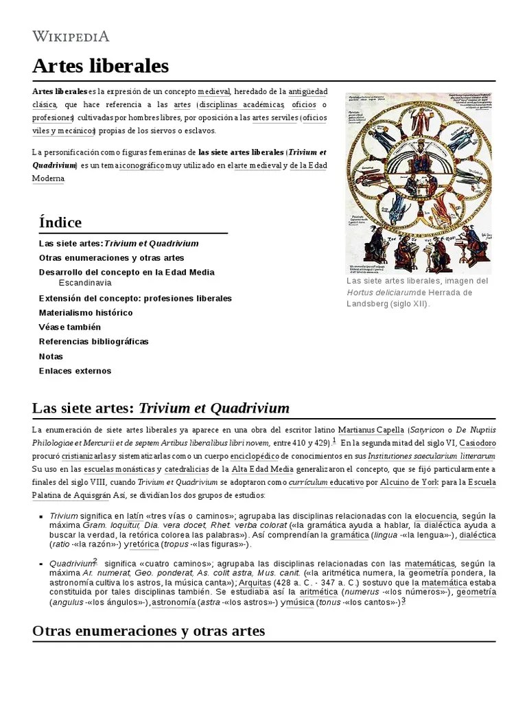 Las 7 artes liberales, trivium, quadrivium y falacias lógicas... En las universidades medievales trivium combinado con el quadrivium comprendía las siete artes liberales. Las 7 artes liberales, trivium, quadrivium y falacias lógicas. El trivium y el quadrivium. El objetivo de esta era hacer que el hombre se instruyera en las ciencias, en la filosofía y en la teología. Eran éstas (acompañadas de su materia principal en latín): El término artes liberales designaba los estudios que tenían como propósito ofrecer conocimientos … C, marciano capella y se convirtieron en la estructura usual del conocimiento medieval. Este método de enseñanza se basa en un plan de estudios esbozado por platón. Primero tenemos las artes triviales (trivium) las cuales se dividen en tres: Al final del mundo clásico, el estudio del trivium y el quadrivium conducían en definitiva a la reflexión filosófica, es decir, que, aunque no formaba parte de las artes liberales, la filosofía acabó por ser considerada como el dominio del conocimiento que englobaba al resto de estas artes y la finalidad suprema de toda educación.
